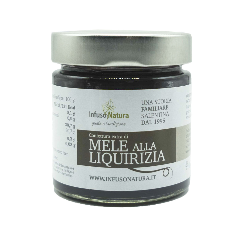 Un incontro sorprendente tra la dolcezza delicata delle mele e l’intensità aromatica della liquirizia. Questa confettura artigianale nasce da una ricetta originale che fonde tradizione e creatività: le mele, cotte lentamente per preservarne il gusto naturale, vengono arricchite con il succo puro di liquirizia che dona profondità e un profumo inconfondibile.