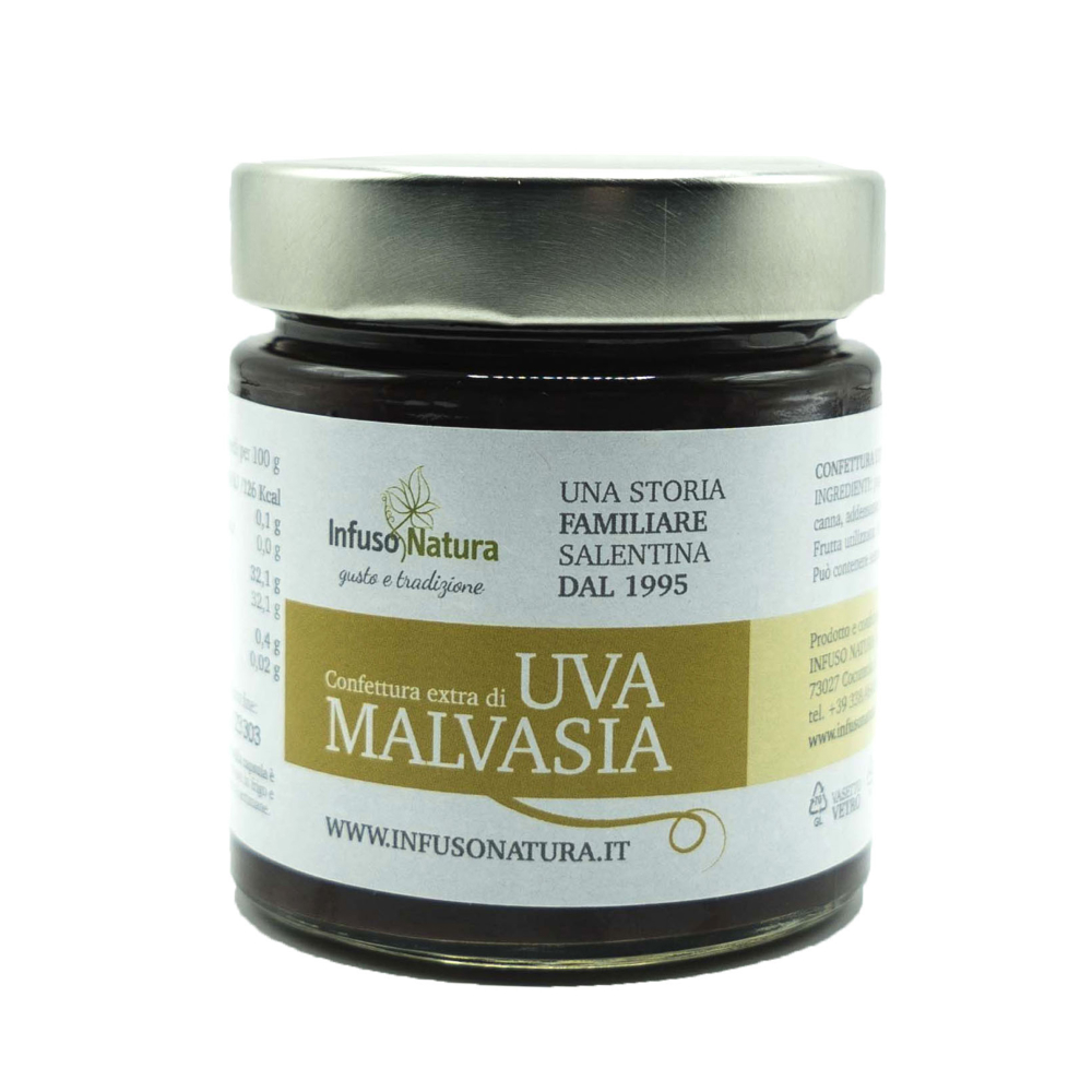 Un gusto elegante e profondo, che racconta la terra salentina in ogni cucchiaino. La nostra confettura extra di uva Malvasia è preparata artigianalmente secondo una ricetta tradizionale, con uva selezionata e zucchero di canna, per preservare l’aroma intenso e il colore violaceo naturale del frutto.