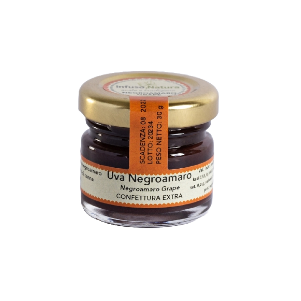 Un gusto intenso e autentico, che racchiude l’anima del Salento. La nostra confettura extra di uva Negroamaro è preparata artigianalmente con grappoli selezionati di questo vitigno tipico, lavorati lentamente per preservarne il profumo profondo e il caratteristico retrogusto amarognolo.
